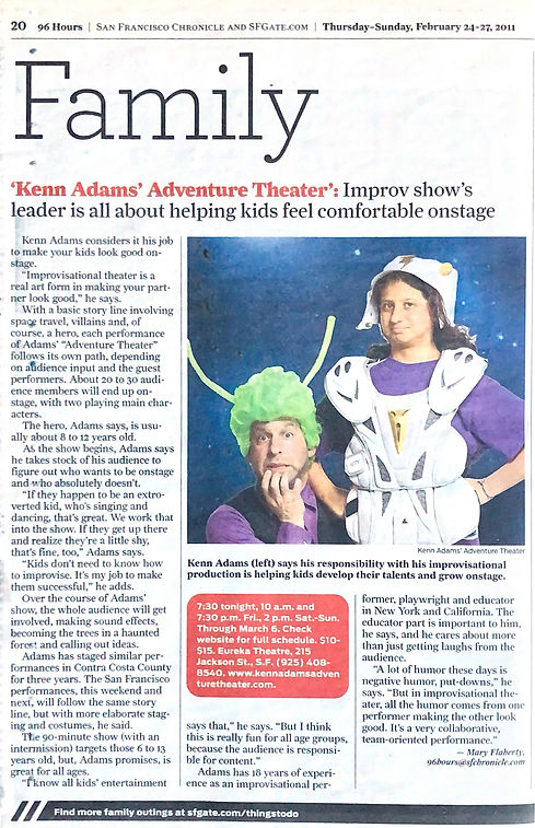 "With a basic story line involving space travel, villains and, of course, a hero, each performance of Adams' "Adventure Theater" follows its own path, depending on audience input and the guest performers. About 20 to 30 audience members will end up onstage, with two playing main characters."